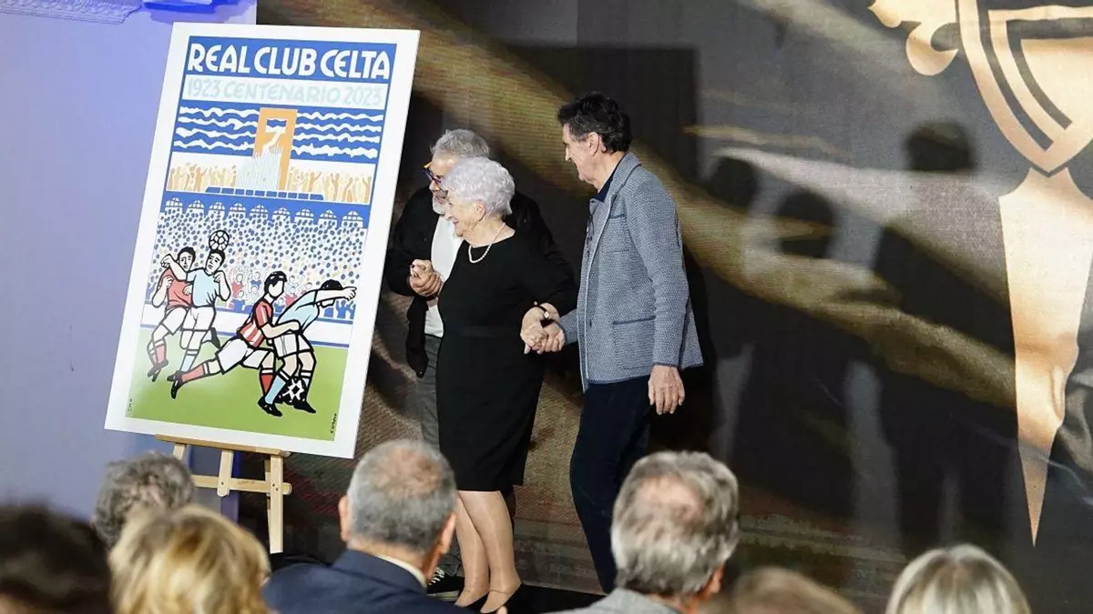 “Fui una de las primeras mujeres en ir al fútbol. Quiero mucho al Celta, pero Quinocho lo quería todavía más yo. Estoy emocionada y pido llegar al centenario”, afirmó Asunción Arias, que fue la encargada de destapar un cartel que recoge referencias al mar y al fútbol con el estilo inconfundible de su autor, Xosé Vizoso.