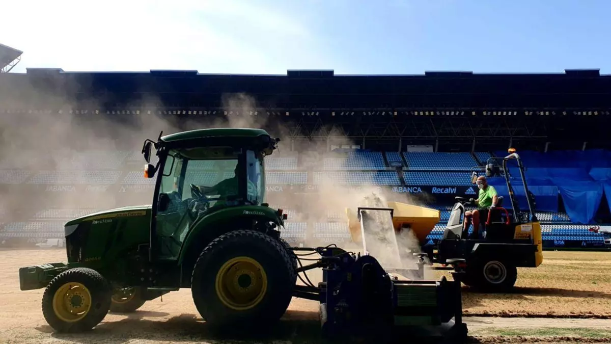 La moderna metodología hace perfectamente posible la implantación del nuevo césped en tres semanas. Contando, además, con una meteorología positiva por la ausencia de lluvias. Con todo, la empresa encargada no tiene tiempo que perder para que el campo esté en perfecto estado de uso el día 29. Tras los preparativos del pasado miércoles, ayer fue el día elegido para entrar de forma definitiva en faena.