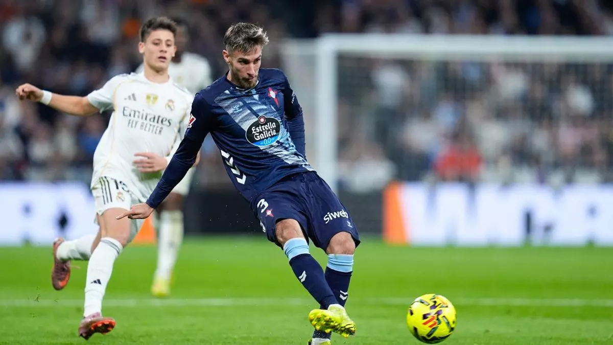 Quizás porque jugar en el Santiago Bernabéu requiere soluciones fuera de lo común, Claudio Giráldez apostó ayer por una nueva versión de su defensa de cinco con carrileros. En la derecha, Carreira era lateral puro para tapar a Vinicius y Mbappé con ayudas de Javi Rodríguez y el correcaminos Pablo Durán y por la izquierda situó a Mingueza, que ejercía de carrilero-medicentro. En lugar de cabalgar por la banda, con el balón para el Celta, se metía hacia el medio para organizar al equipo desde ahí y, por supuesto, hacerlo con mucha más eficiencia que Miguel Román e Ilaix Moriba. El primero atendía más a las vigilancias y el segundo, a incorporarse al ataque. Por supuesto, el Real Madrid nunca ajustó este movimiento, que el equipo blanco no es una escuadra para adaptaciones tácticas, menos cuando van sobre la marcha.