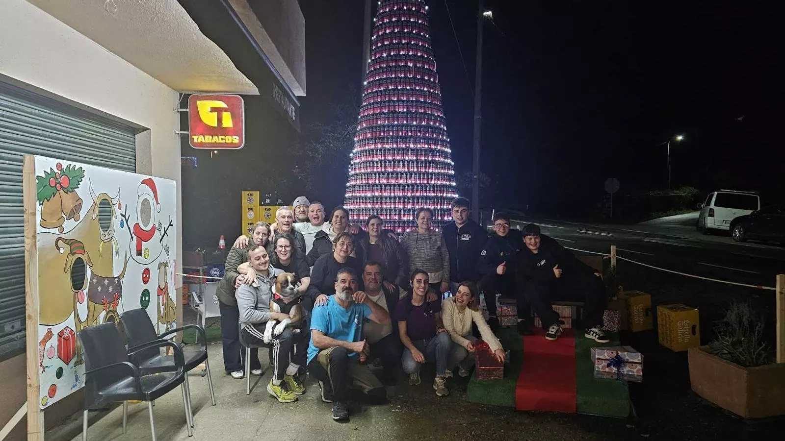 El bar O Palancas, situado en la parroquia de Villar, ha colocado a las puertas del local un árbol de Navidad hecho con latas de Estrellas Galicia que han estado guardando durante el año.