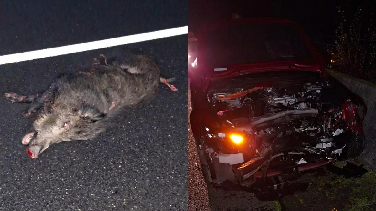 Poco antes de las 7 de la mañana (6’50h), un conductor que circulaba por el carril derecho de la AG1, en dirección a la Plisan, en plena oscuridad se vio sorprendido por un jabalí que, de repente, surgió de la oscuridad por el carril izquierdo empotrándose contra el vehículo a pesar de los esfuerzos del joven intentando esquivarlo. A esa hora aún es noche cerrada y la nula iluminación de la vía tampoco ayudó. El coche, tras el impacto quedó convertido en chatarra y el animal muerto.