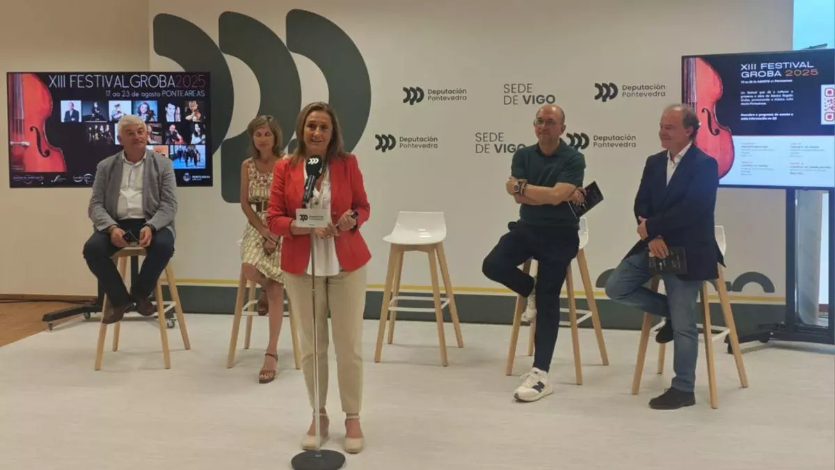 Después de la presentación el pasado mes de junio en Madrid de la mano de la Fundación Groba, ayer, el Festival Groba fue protagonista en la sede de Vigo de la Diputación de Pontevedra, donde la vicepresidenta, Luisa Sánchez, como anfitriona, aprovechó para ponerlo en valor como “un dos espectáculos de música de cámara máis importantes da provincia de Pontevedra”. Reafirmó el apoyo de Diputación que, a través de un convenio de colaboración “aporta 15.000 euros” al festival que, este verano, ofrece un programa de ocho conciertos gratuítos a cargo de 30 reconocidos intérpretes a nivel internacional. “Cumprides así un dos soños do mestre Groba, ao difundir desde Galicia o mellor da música e garantir que o acceso á cultura sexa universal”, afirmó la vicepresidenta provincial, felicitando a la organización “por deixar sempre o listón tan alto”. Junto a Luisa Sánchez, participaron en la presentación, el propio director de Festival, Rogelio Groba Otero, el secretario xeral de la Consellería de Cultura de la Xunta de Galicia, la alcaldesa de Ponteareas y su primer teniente alcalde. Todos coincidieron en poner de relieve su importancia como plataforma de difusión cultural y oportunidad única para escuchar en directo, a los mejores músicos del mundo. “O Festival Groba é, sobre todo, unha declaración de principios: música feita con rigor e paixón, ofrecida con xenerosidade a toda a cidadanía. Música para lembrar quen somos, de onde vimos e cara onde queremos ir”, manifestó Rogelio Groba Otero, director del festival.