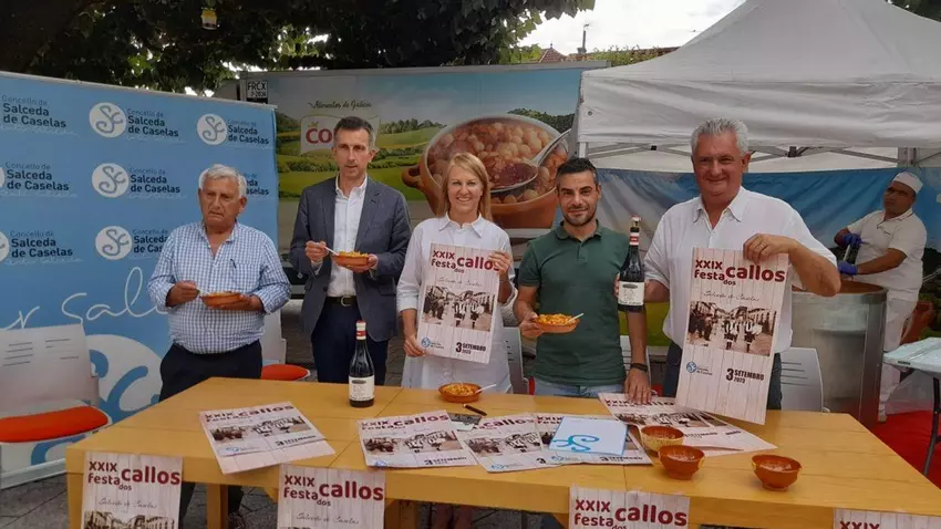 La Praza do Concello acogió ayer la presentación de la XXIX Festa dos Callos de Salceda de Caselas, que se celebra el primer domingo de septiembre (día 3). El concejal de Cultura, Álex Rodríguez, fue el anfitrión del acto junto a la alcaldesa, Loli Castiñeira, representantes del Grupo Coren, Ángel Rodríguez y Alejandro Alonso, y el presidente del grupo Señorío de Rubiós, Antonio Méndez, quien agradeció al Concello que contase un año más con esta bodega de As Neves y presentó el vino que maridará con los callos: “un Sousón Tinto, a uva máis abundante de Rubiós”.