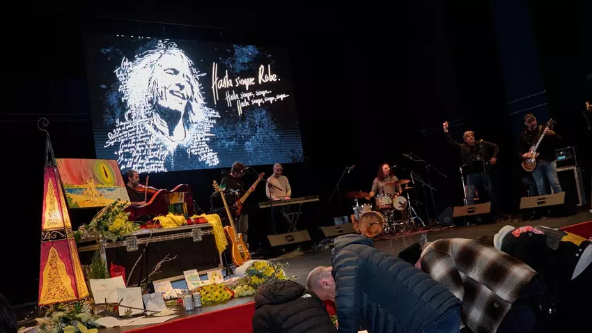 Fotos, flores, cuadros y guitarras han acompañado a las cenizas de Roberto Iniesta en el escenario del Palacio de Congresos de Plasencia, donde también han tocado a mediodía los músicos de su banda en una actuación que ha emocionado a los seguidores del artista que han podido escucharlo.