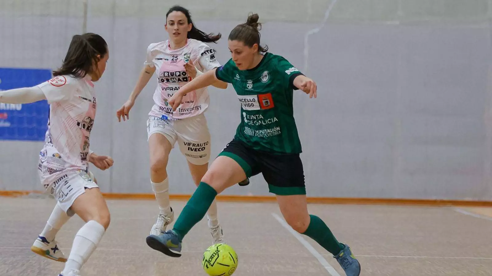 El equipo verde parecía KO… pero supo recomponerse. Tiempo muerto de Gael Madarnas y el equipo cambió. Clau robaba, buscaba a Sabela, ésta le devolvía el pase, y el chut de la de Aldán se iba al palo a 6:26 del descanso. Cuatro segundos después, Mar robaba de cabeza, el cuero le caía a Clau, que colocaba el balón entre las piernas de Ana López para igualar. Partido nuevo.