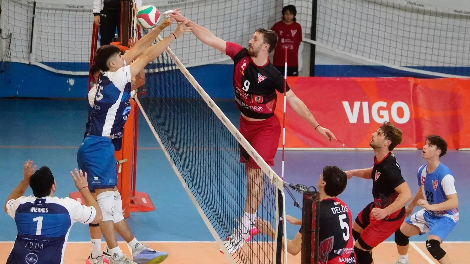 En el encuentro de ayer, con unas gradas animadas por los seguidores de ambos conjuntos, el Club Vigo fue a remolque en los compases iniciales del primer set, pero se repuso y cobró una ventaja de tres puntos (15-12) que fue aumentando hasta alcanzar los siete al final (25-18).