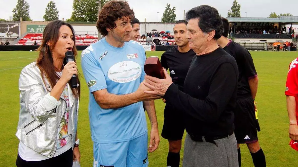 Patxi Salinas entrega un obsequio a otro ex capitán del Celta, Manolo, durante el partido por las Cíes.