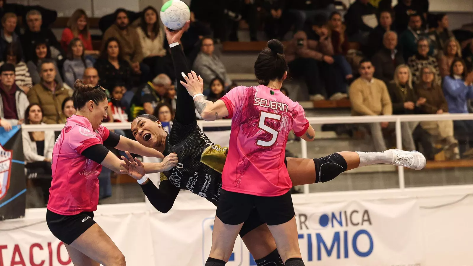 Antes y después del parcial que marcó la diferencia se vio un duelo con ataques atascados, más pérdidas de las previstas, defensas y mucho, casi infinito, protagonismo para las guardametas, con una local Balzinc que estuvo en el 40% de eficacia y la visitante Kapitanovic que firmó el 35%. Salió con ánimo de marcar diferencias la escuadra de Ana Seabra, pero rápido quedó patente que sería preciso trabajar mucho la eliminatoria para pasarla. Incluso, el Erice tuvo unos minutos con defensa abierta en la que Shandy Barbosa ejercía de adelantada. Duró poco y, una vez establecido el 6.0 cuando Ceci Cacheda entró en pista (ya no la abandonaría en ataque), el enfrentamiento entró en una fase de zozobra. La defensa local mandada, la visitante repelía los ataques miñotos a base de golpes y el marcador se estancó en un 3-3 que parecía hasta hacer callar a los bombos que siempre aprientan desde la esquina de ‘O Inferno’.