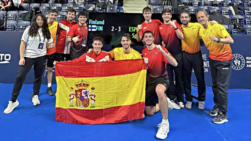 El campeonato empezó con mal pie para España con la derrota en individual de su número uno, Pablo Abián, contra el finés Joakim Oldorff entre extraños sets: 11-21, 21-7 y 21-14. Pintaba muy complicada la remontada, iniciada, eso sí, en seguida en el doble formado por Rubén García y Carlos Piris, quienes superaron a Eliel Melleri y Niilo Nyqvist por 21-7 y 21-15. Pero la gran sorpresa del día la dio en el siguiente individual Álvaro Leal, al lograr un triunfo de enorme mérito ante Kalle Koljonen, medallista europeo en 2021, al que derrotó por 21-18 y 21-17. Con el marcador a favor, Jacobo Fernández y Alberto Perals tenían en sus manos garantizar el triunfo y así lo hicieron tras dos sets ante Alvar Melleri y Joakim Oldorff, con un marcador de 21-14 y 21-19.