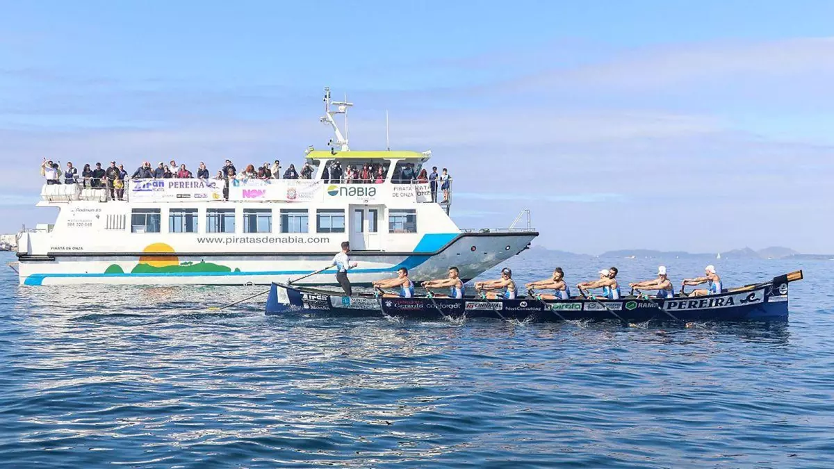 Día de mar en calma y de desafío deportivo y a motor. La Ría de Vigo es atravesada diariamente por el barco de pasajeros con destino a Moaña y Cangas. Lo hace desde hace más de cien años cuando los vapores sustituyeron a las velas y creció el negocio. Es decir, cuando nació Tirán Pereira, hace treinta años, los ‘Vapores de Pasajes' ya eran historia viva de la Ría de Vigo y uno de sus herededos, el barco de Nabia, fue el que midió ayer su ritmo con el de las traineras de la entidad moañesa, la masculina y la femenina.