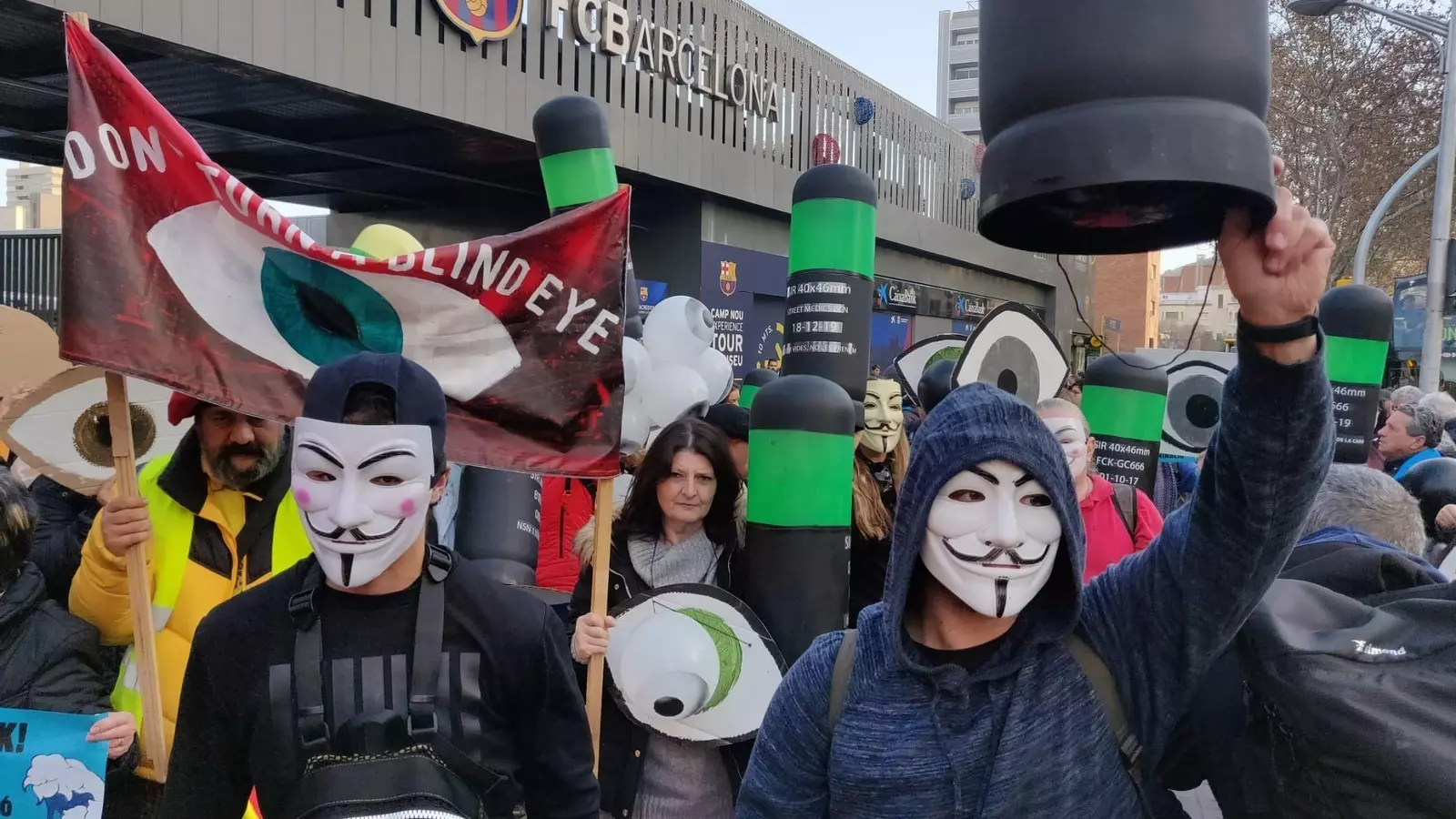Un grupo de una treintena de personas ha recorrido el perímetro del Camp Nou con pelotas hinchables negras y reproducciones de balas de foam de medio metro aproximadamente en señal de protesta por el uso de proyectiles antidisturbios.