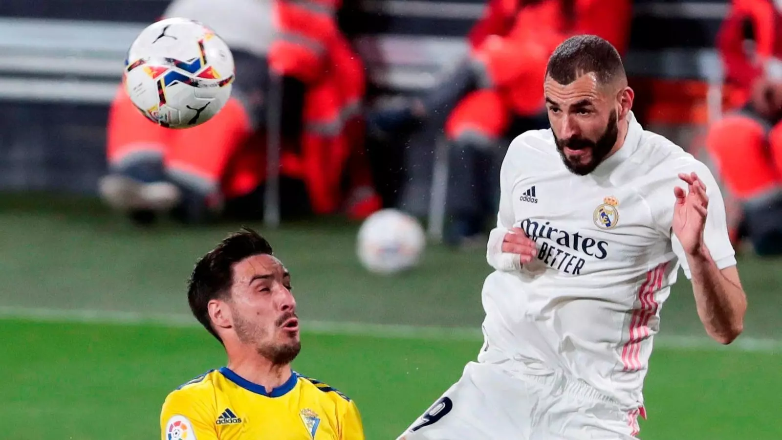 El Cádiz fue un equipo roto que aguantó media hora. Era cuestión de tiempo. Con el peso del juego y la posesión blanca eterna. Apareció Rodrygo con velocidad, frenado con un agarrón a su camiseta de Jairo que Mateu Lahoz no interpretó como penalti. Tres minutos después acudía a la revisión del VAR para ver un pisotón de Iza sobre Vinicius. Tras 25 jornadas sin una pena máxima, Benzema no perdonó.