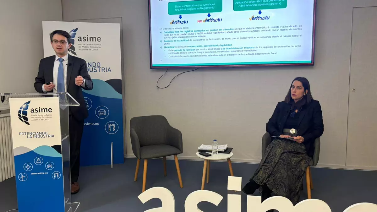 Vigo acogió ayer una jornada informativa sobre el ‘verifactu’, el nuevo reglamento de sistemas de facturación desarrollado por la Agencia Tributaria que se aplaza a 2027. La sesión, organizada por Asime y Garrigues, analizó las principales novedades tributarias a empresas y autónomos, a los que los expertos orientaron sobre cómo prepararse, revisar sus adaptaciones y evaluar el impacto de la moratoria que acaba de anunciar el Gobierno. “Para Asime es prioritario acompañar al tejido empresarial en todos los procesos de adaptación normativa y digital”, indica Alejandra Martínez, directora financiera de la patronal metalúrgica, que considera que la moratoria “no debe interpretarse como un freno”, sino “como una ventaja para prepararse mejor, revisar sistemas internos y avanzar con más seguridad".