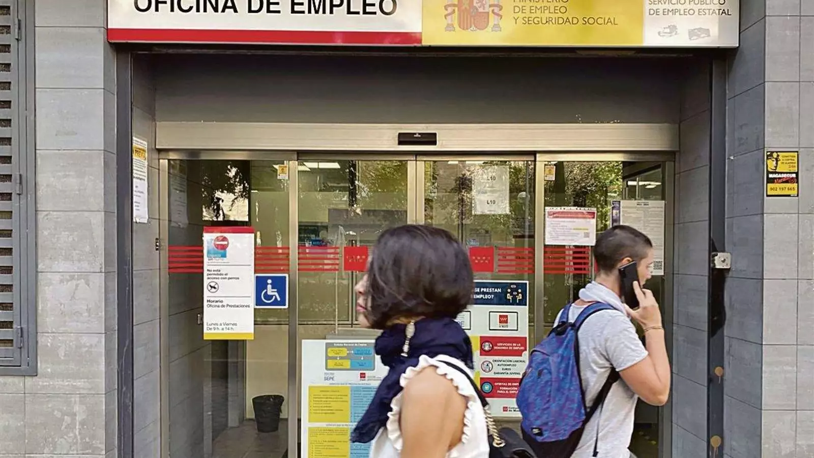 Dos jóvenes pasean por delante de una oficina de empleo.