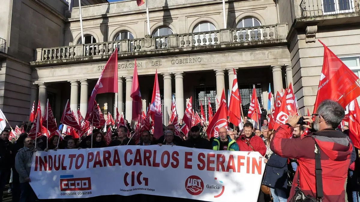 Los sindicatos CIG, CC OO y UGT trasladaron ayer sus protestas para reclamar el indulto a Carlos Rivas y Serafín Rodríguez hasta la Subdelegación del Gobierno en Pontevedra. Critican que llevan tres meses esperando que les respondan a la petición de reunión con la responsable del organismo para abordar la situación de los dos afectados, tras casi cuatro años a la espera del indulto que evite el ingreso en prisión.