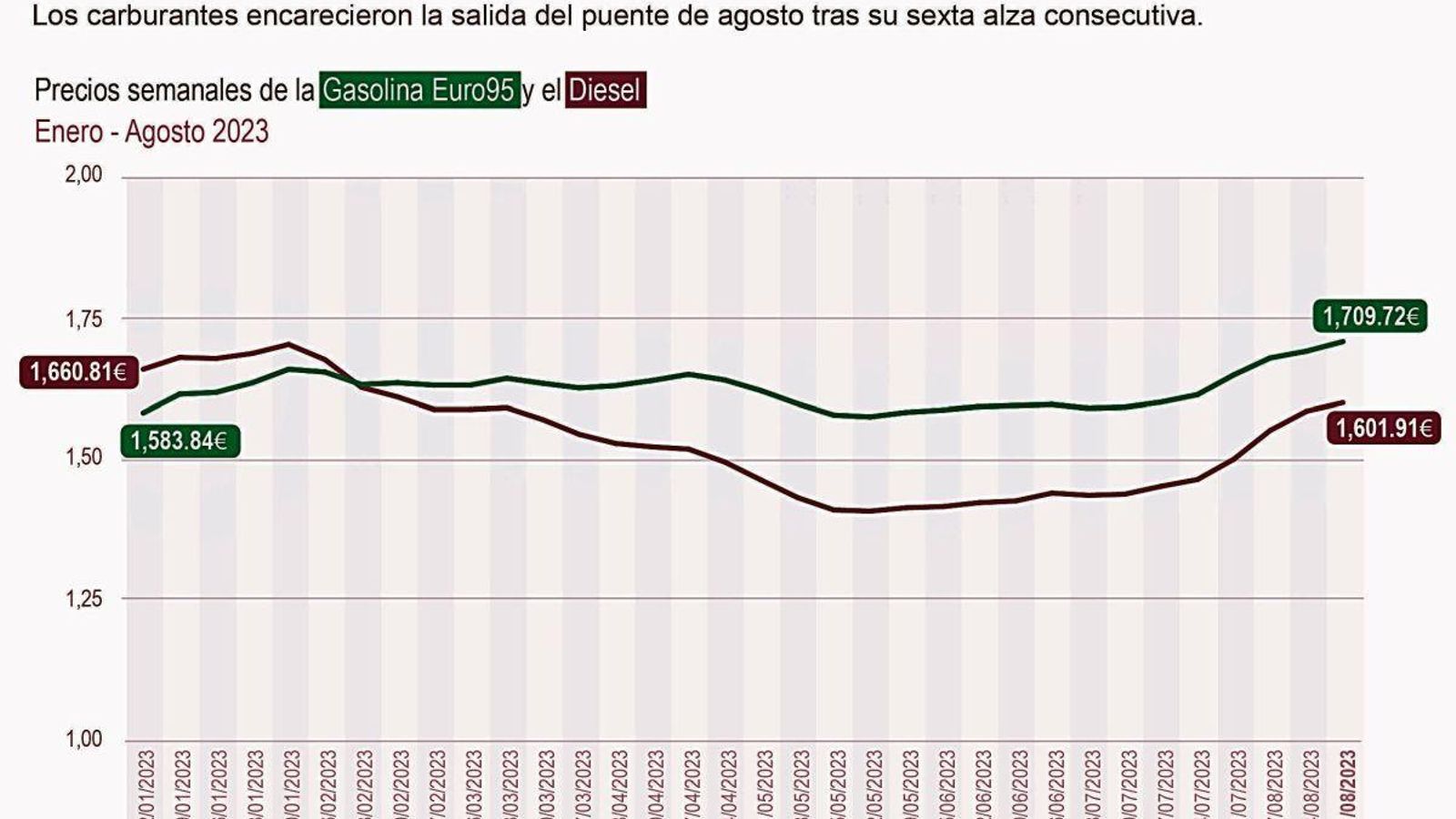El precio medio de los carburantes encadenó su séptima semana consecutiva de subidas, lo que llevó al litro de gasolina a superar la cota de los 1,7 euros y al del gasóleo a rebasar los 1,6 euros. En concreto, la gasolina se encareció esta semana un 1% con respecto a hace siete días, para situarse en los 1,709 euros por litro, su valor máximo en lo que va de 2023 y el más alto desde finales de noviembre, aunque entonces estaba vigente la subvención de 20 céntimos por litro implantada por el Gobierno por la crisis por la guerra en Ucrania.