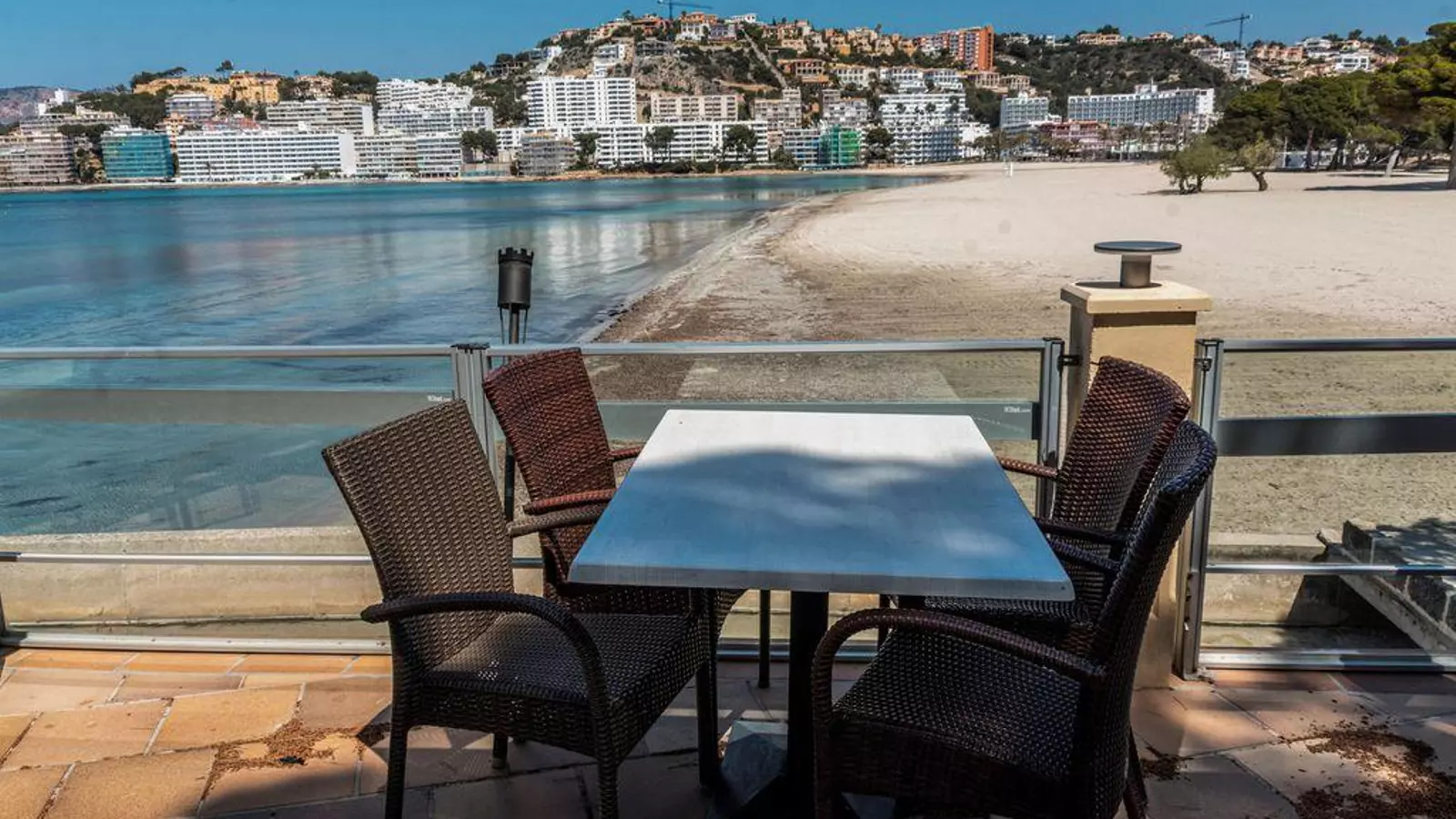 Terraza de un restaurante cerrado con vistas a la playa de Santa Ponça, también vacía de público.