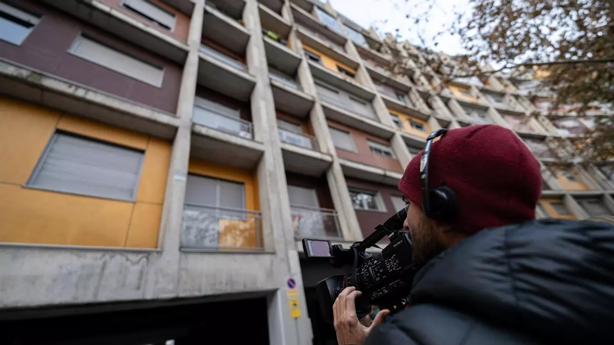 Un cámara de televisión graba el bloque de pisos donde se ha producido el doble asesinato, en la calle Jacobeo del barrio de Carabanchel. // EP