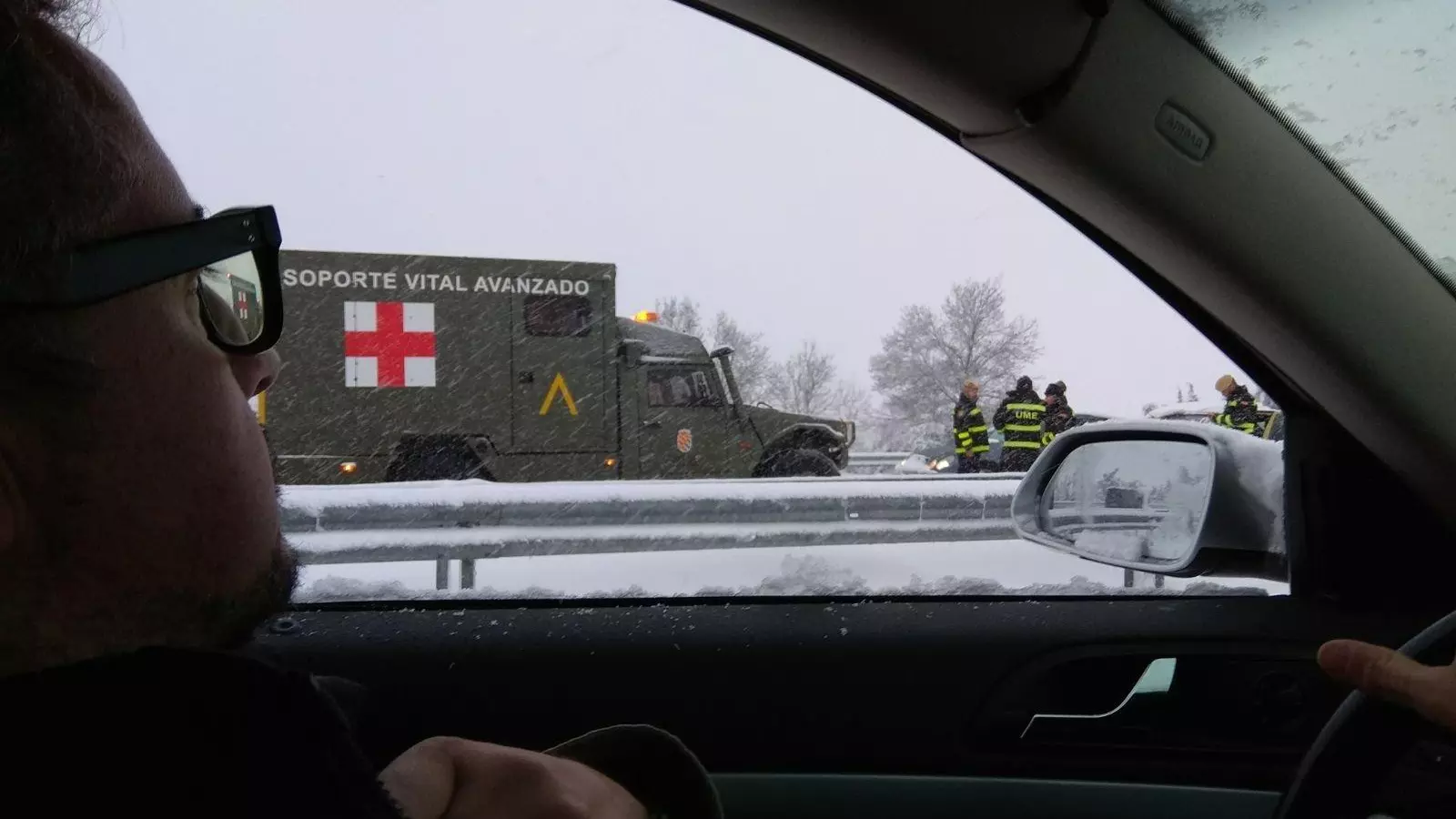 "Mil metros después entramos en esta ratonera", dijo Díaz, quien aseguró que desde la 21,15 horas del sábado tan solo vieron pasar dos máquinas quitanieves, un par de coches de la Guardia Civil y un convoy de la UME. "La situación es desesperante no nos hemos movido ni un centímetro en toda la noche, nos hemos quedado sin agua y sin comida y la pequeña tenía fiebre", explicó Díaz, quien lamentó que nadie se interesara por su situación en toda la noche y ni siquiera el panel luminoso cercano ofreciera información.