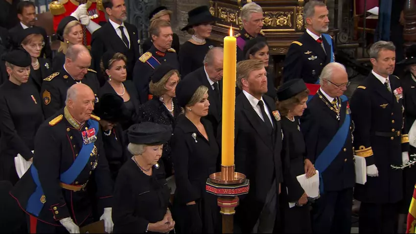 Don Juan Carlos y doña Sofía se sentaron en un banco en la abadía de Westminster junto a Felipe VI y la reina Letizia, que son quienes representan oficialmente a España en las honras fúnebres de la soberana británica.