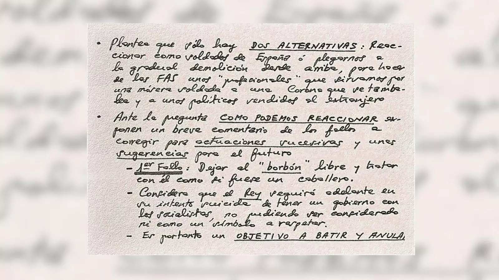 En un documento encabezado por “militares españoles” se dan unas consignas para actuar después del golpe del 23-F en el que afirman que el primer fallo fue “dejar al Borbón libre” y tratarle como un caballero por lo que consideran que se convirtió en un “objetivo a batir y anular”. Además añaden una serie de recomendaciones para actuar en “acciones sucesivas”.