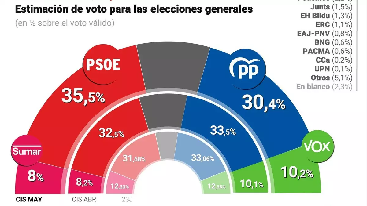 El PSOE vuelve a ser primera fuerza en estimación de voto con el 35,5% de los votos, el PP lograría el 30,4%, VOX sería tercera fuerza con el 10,2%, SUMAR se quedaría con el 8% y Podemos obtendría un 2,2%.