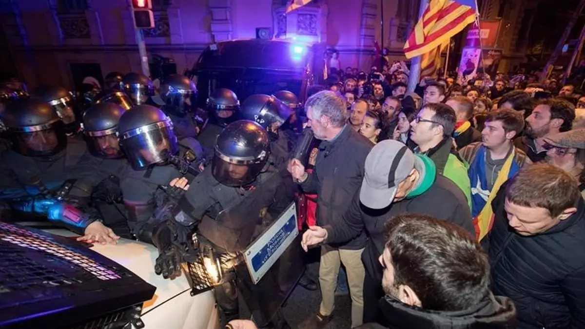 Los Mossos d'Esquadra usaron sus porras y dispararon salvas al aire para mantener el perímetro de seguridad en los alrededores de la Delegación del Gobierno en Barcelona, donde cientos de manifestantes independentistas trataron de rebasar el cordón policial, con tensión y empujones, en protesta por el encarcelamiento de líderes del procés. Se registraron, al menos, cinco heridos leves con golpes y contusiones.