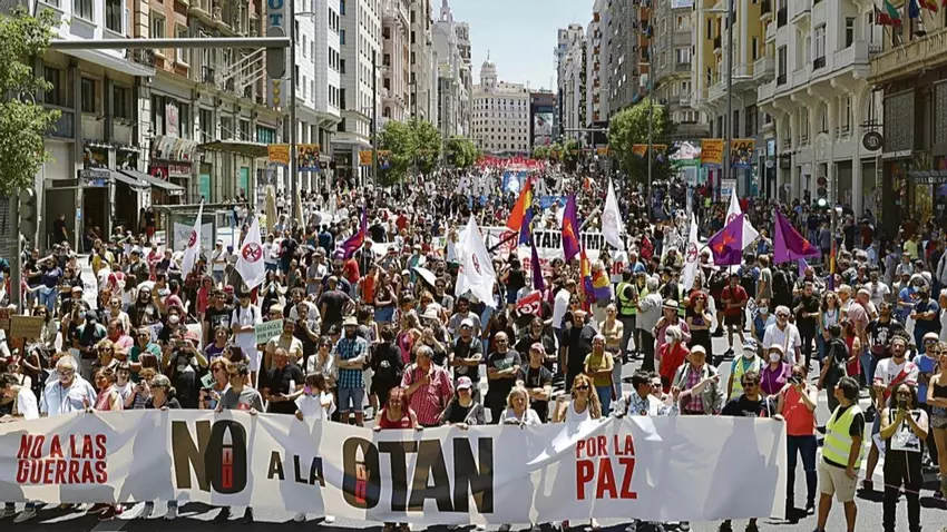 Unas 2.200 personas, según la Delegación del Gobierno en Madrid, se manifestaron ayer para rechazar la celebración de la cumbre de la OTAN en España, que tendrá lugar en la capital del Estado el jueves y viernes de esta semana, y plantear una alternativa a la alianza atlántica, basada en los principios de “paz” y “desmilitarización”. En la marcha, convocada por la Asamblea Popular contra la Guerra, la Plataforma Estatal por la Paz y la Asamblea OTAN NO Madrid, los asistentes corearon consignas como “OTAN no, bases fuera” o “gastos militares para escuelas y hospitales”, y portaron pancartas con lemas como “paz”, “no a la guerra” o “vuestras guerras no las pagamos”.