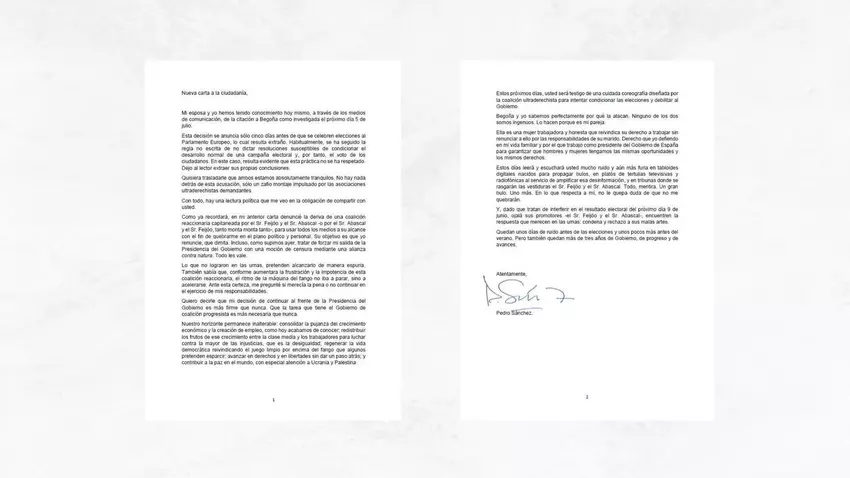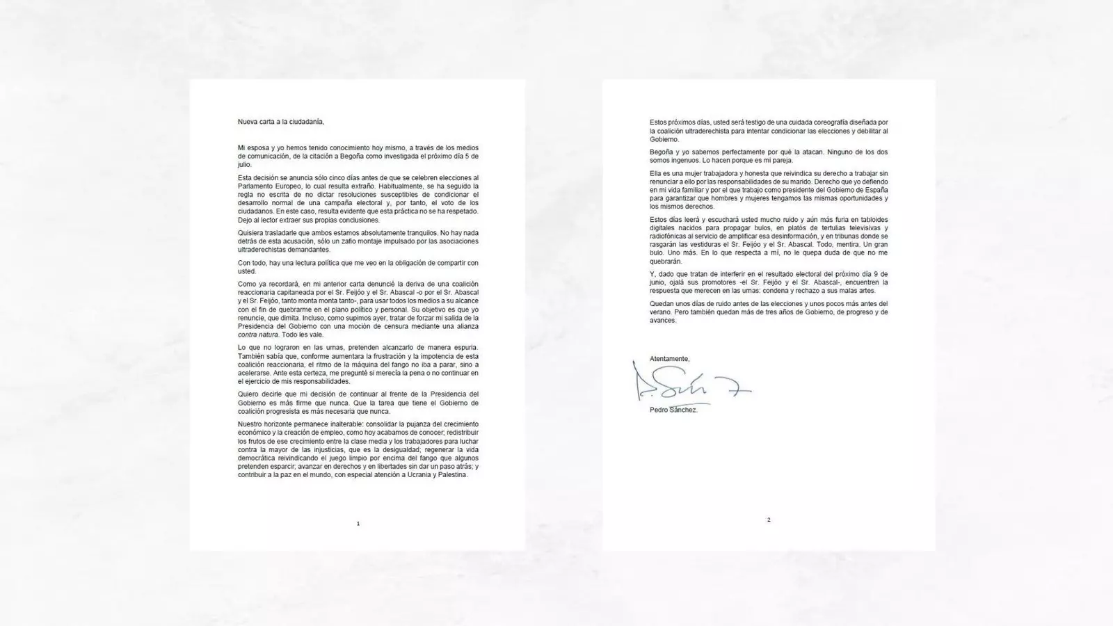 Nueva carta a la ciudadanía. Mi esposa y yo hemos tenido conocimiento hoy mismo, a través de los medios de comunicación, de la citación a Begoña como investigada el próximo día 5 de julio. Esta decisión se anuncia sólo cinco días antes de que se celebren elecciones al Parlamento Europeo, lo cual resulta extraño. Habitualmente, se ha seguido la regla no escrita de no dictar resoluciones susceptibles de condicionar el desarrollo normal de una campaña electoral y, por tanto, el voto de los ciudadanos. En este caso, resulta evidente que esta práctica no se ha respetado. Dejo al lector extraer sus propias conclusiones. Quisiera trasladarle que ambos estamos absolutamente tranquilos. No hay nada detrás de esta acusación, sólo un zafio montaje impulsado por las asociaciones ultraderechistas demandantes. Con todo, hay una lectura política que me veo en la obligación de compartir con usted. Como ya recordará, en mi anterior carta denuncié la deriva de una coalición reaccionaria capitaneada por el Sr. Feijóo y el Sr. Abascal -o por el Sr. Abascal y el Sr. Feijóo, tanto monta monta tanto-, para usar todos los medios a su alcance con el fin de quebrarme en el plano político y personal. Su objetivo es que yo renuncie, que dimita. Incluso, como supimos ayer, tratar de forzar mi salida de la Presidencia del Gobierno con una moción de censura mediante una alianza contra natura. Todo les vale. Lo que no lograron en las urnas, pretenden alcanzarlo de manera espuria. También sabía que, conforme aumentara la frustración y la impotencia de esta coalición reaccionaria, el ritmo de la máquina del fango no iba a parar, sino a acelerarse. Ante esta certeza, me pregunté si merecía la pena o no continuar en el ejercicio de mis responsabilidades. Quiero decirle que mi decisión de continuar al frente de la Presidencia del Gobierno es más firme que nunca. Que la tarea que tiene el Gobierno de coalición progresista es más necesaria que nunca. Nuestro horizonte permanece inalterable: consolidar la pujanza del crecimiento económico y la creación de empleo, como hoy acabamos de conocer, redistribuir los frutos de ese crecimiento entre la clase media y los trabajadores para luchar contra la mayor de las injusticias, que es la desigualdad; regenerar la vida democrática reivindicando el juego limpio por encima del fango que algunos pretenden esparcir, avanzar en derechos y en libertades sin dar un paso atrás; y contribuir a la paz en el mundo, con especial atención a Ucrania y Palestina. Estos próximos días, usted será testigo de una cuidada coreografía diseñada por la coalición ultraderechista para intentar condicionar las elecciones y debilitar al Gobierno. Begoña y yo sabemos perfectamente por qué la atacan. Ninguno de los dos somos ingenuos. Lo hacen porque es mi pareja. Ella es una mujer trabajadora y honesta que reivindica su derecho a trabajar sin renunciar a ello por las responsabilidades de su marido. Derecho que yo defiendo en mi vida familiar y por el que trabajo como presidente del Gobierno de España para garantizar que hombres y mujeres tengamos las mismas oportunidades y los mismos derechos. Estos días leerá y escuchará usted mucho ruido y aún más furia en tabloides digitales nacidos para propagar bulos, en platós de tertulias televisivas y radiofónicas al servicio de amplificar esa desinformación, y en tribunas donde se rasgarán las vestiduras el Sr. Feijóo y el Sr. Abascal. Todo, mentira. Un gran bulo. Uno más. En lo que respecta a mí, no le quepa duda de que no me quebrarán. Y, dado que tratan de interferir en el resultado electoral del próximo dia 9 de junio, ojalá sus promotores -el Sr. Feijóo y el Sr. Abascal-, encuentren la respuesta que merecen en las urnas: condena y rechazo a sus malas artes. Quedan unos días de ruido antes de las elecciones y unos pocos más antes del verano. Pero también quedan más de tres años de Gobierno, de progreso y de avances.