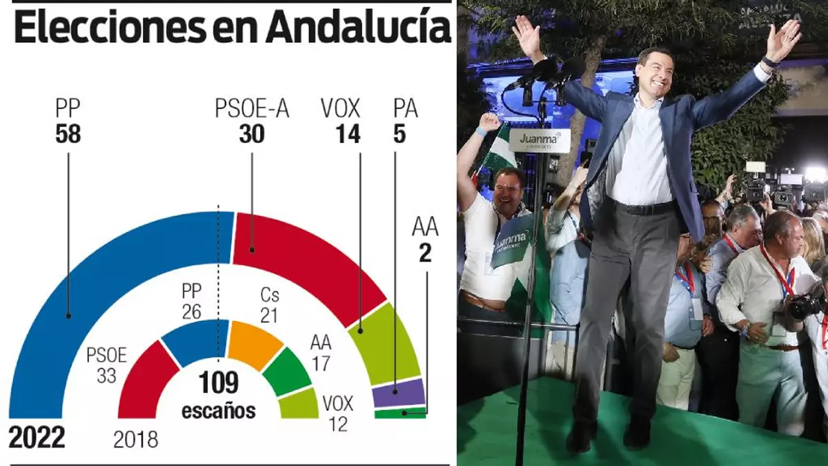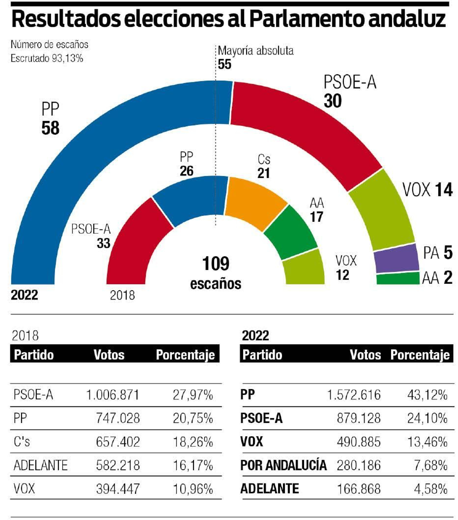 Catorce años después, Andalucía vuelve a otorgar a un partido mayoría absoluta en las urnas, por primera vez al Partido Popular, con un total de 58 escaños, por lo que gana 32 diputados más y habrá un gobierno monocolor, al no tener que pactar con ninguna otra formación. Por su parte, el PSOE consiguió 30 escaños, 3 menos que en las autonómicas de 2018.