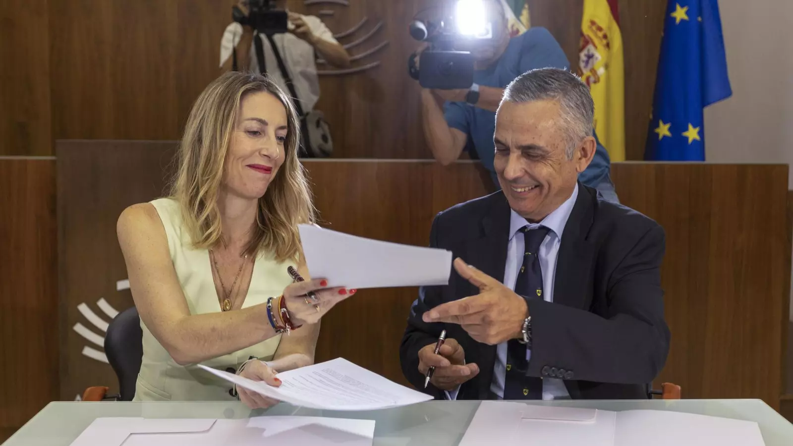 Guardiola y Gordillo han suscrito este acuerdo en la Sala de la Autonomía del Parlamento extremeño, con sonrisas y con un gran apretón de manos con el que han posado durante minutos ante los medios de comunicación. El Partido Popular y Vox han acordado un Gobierno de coalición en Extremadura que presidirá la popular María Guardiola y en el que la formación de Santiago Abascal tendrá una consejería, la de Gestión Forestal y Mundo Rural.