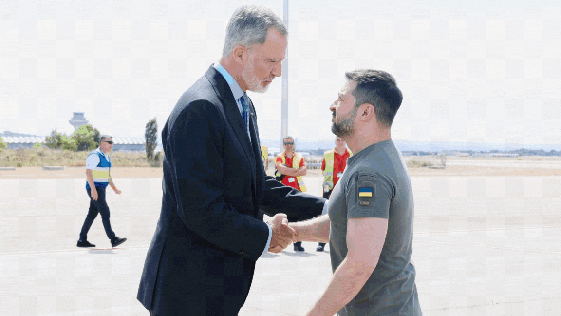El rey Felipe VI ha recibido a pie de pista al presidente de Ucrania, Volodimir Zelenski, en el aeropuerto de Barajas en la que es su primera visita oficial a España y durante la que está previsto que firme un multimillonario acuerdo de seguridad con el presidente del Gobierno, Pedro Sánchez.