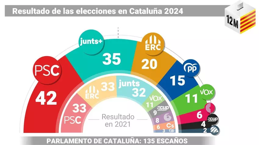 Los socialistas logran 42 escaños, cerca de 900.000 votos y casi el 28% de los apoyos y se sitúan como primera fuerza destacada lejos de Junts que ocupa el segundo lugar con 35 escaños. Los de Carles Puigdemont ganan 3 parlamentarios respecto a 2021, pero el hundimiento de ERC que pierde 13 asientos y se queda en 20 y de la CUP que se queda en 4 escaños tras perder 5, deja a los partidos que impulsaron el procés muy lejos de la mayoría que tenían hasta el momento.