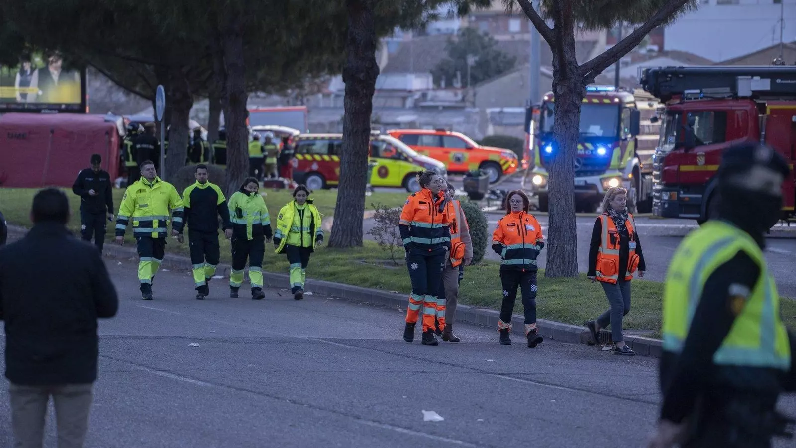 Equipos de sanitarios y emergencias en las inmediaciones del edificio incendiado. // EP