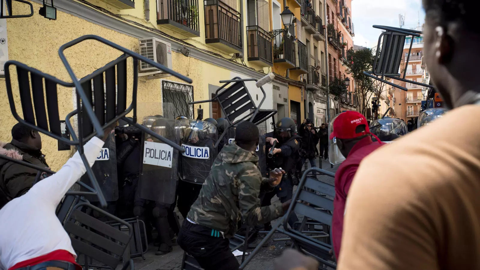 Un grupo de senegaleses lanza sillas a los policías.