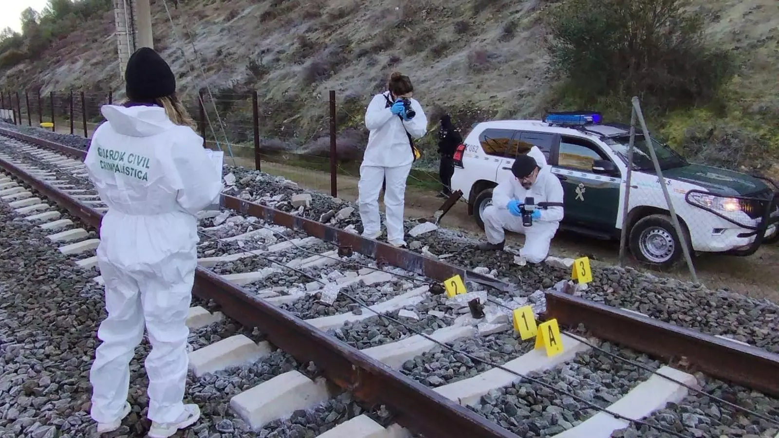 Una imagen de las labores de investigación que está llevando a cabo la Guardia Civil sobre el accidente ferroviario de Adamuz (Córdoba) muestra un trozo del raíl desprendido de las vías de alta velocidad en la zona en la que el pasado domingo por la tarde se registró la catástrofe. Los agentes del Equipo Central de Inspecciones Oculares de Criminalistíca de la Guardia Civil tomaron diferentes fotografías sobre algunos tramos en los que se puede apreciar un trozo del raíl desgajado, aunque fuentes de la investigación subrayaron que aún es pronto para determinar si guarda relación directa con las causas del siniestro o, por el contrario, si es consecuencia del accidente.