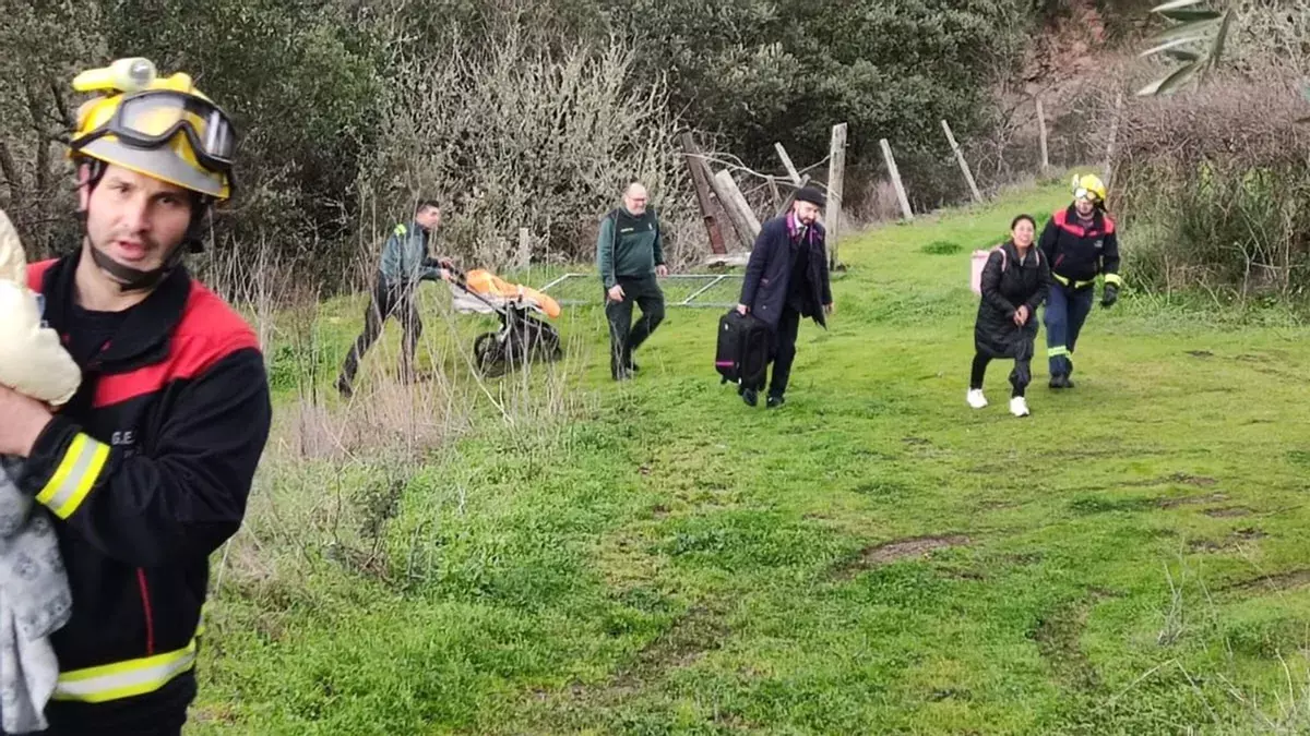 Tras salir del tren, los viajeros emprendieron su odisea a pie, primero por las vías, para luego hacerlo monte a través. “Aproveitamos un medio camiño que había a uns 30 metros da vía do tren. Había 19 pasaxeiros máis o maquinista, cun bebé e unha persoa maior”, señalaron desde GES Quiroga. Los servicios de emergencia ayudaron en brazos a subir a estas personas y también tuvieron que “aplanar y segar para poder ir por el monte a un pueblo allá arriba de todo”, como comentó Castro.