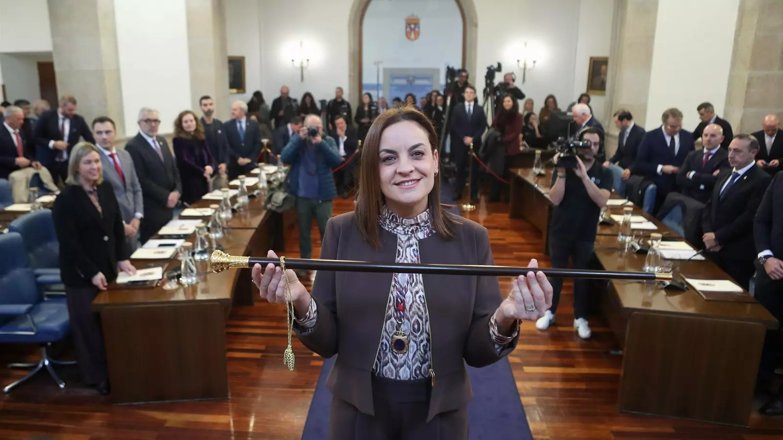 La nueva presidenta ha prometido el cargo y ha recibido el bastón de mando y la insignia que lo acompaña de manos del vicepresidente de la Diputación, después de firmar el libro de honor, tal y como estableció el protocolo.