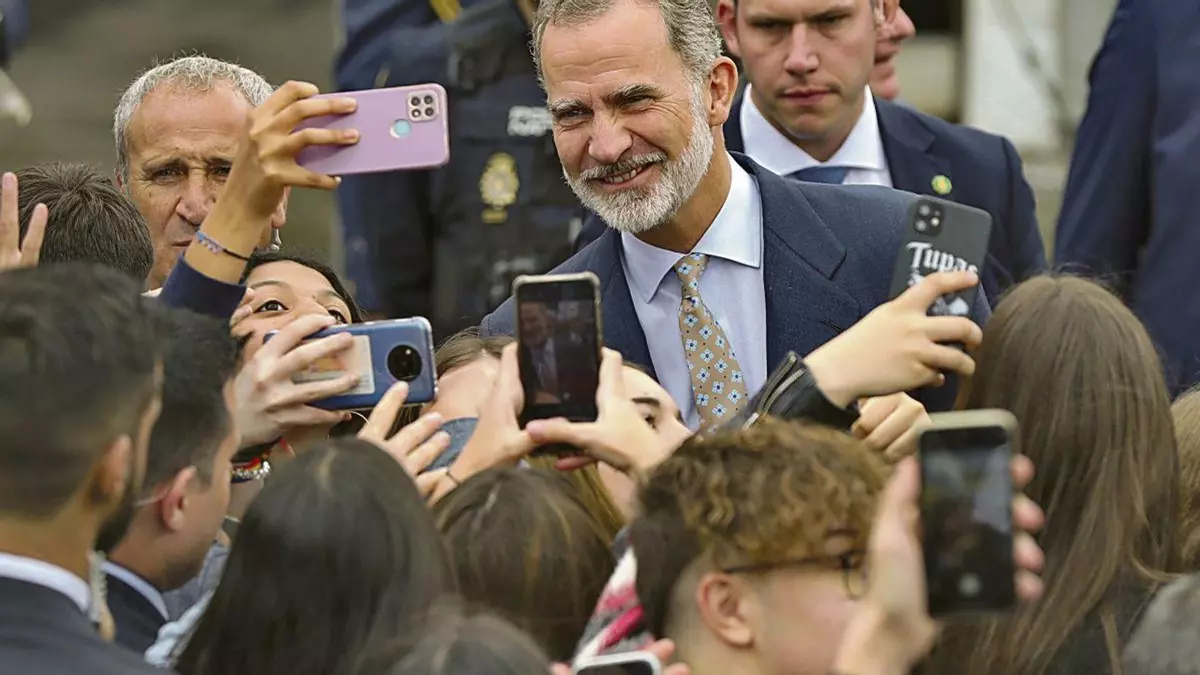 Antes de recorrer la Feria del Talento, Felipe VI se acercó a saludar a los vecinos y curiosos que rodeaban las instalaciones municipales, algunos de ellos con banderas de España. Les dio la mano y se sacó algún “selfie” mientras lo vitoreaban y aplaudían.