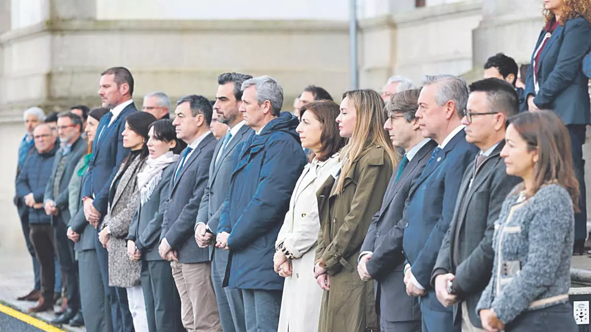En San Caetano, la sede del Gobierno gallego, el presidente Alfonso Rueda presidió a las 12,00 horas el minuto de silencio acompañado de su equipo de gobierno y de trabajadores de la Administración autonómica.