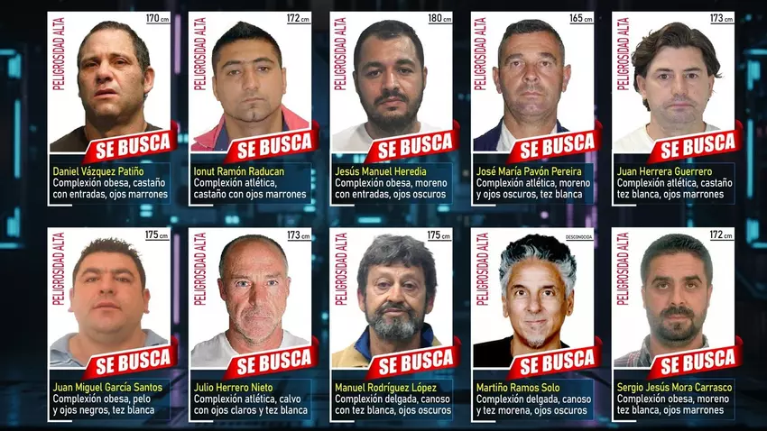 - Jesús Manuel Heredia Heredia, alias 'El Pantoja'. Natural de Algeciras (Cádiz), de 40 años, está reclamado por delitos contra la salud pública y quebrantamiento de condena. Se le considera uno de los mayores traficantes de droga de la historia de España, líder del clan de 'Los Pantoja'. Se le considera discípulo de Abdellah El Haj, conocido como 'el Messi del hachís'. De complexión obesa, 1,80 metros de altura, piel morena, ojos marrones y pelo oscuro con entradas, está considerado como de alta peligrosidad.