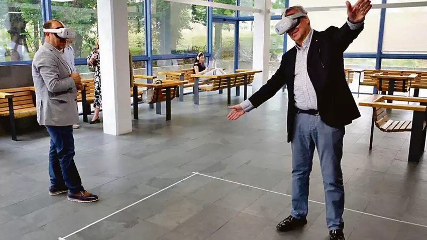 Con la orientación de coordinadores de la Red Gallega de Promoción de la Salud, el conselleiro de Sanidad tuvo la oportunidad de probar las gafas de realidad virtual con la aplicación EnMovemento.