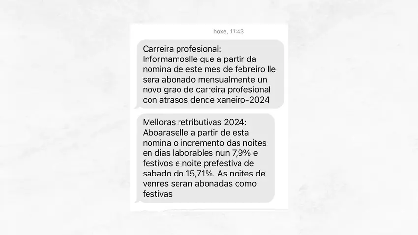 La asesoría jurídica de la Xunta justificó que "el cierre de la nómina" se había realizado el día anterior, jueves 15 de febrero, y que lo "habitual" es que el Sergas comunique al personal la fecha efectiva de estas mejoras mediante SMS.