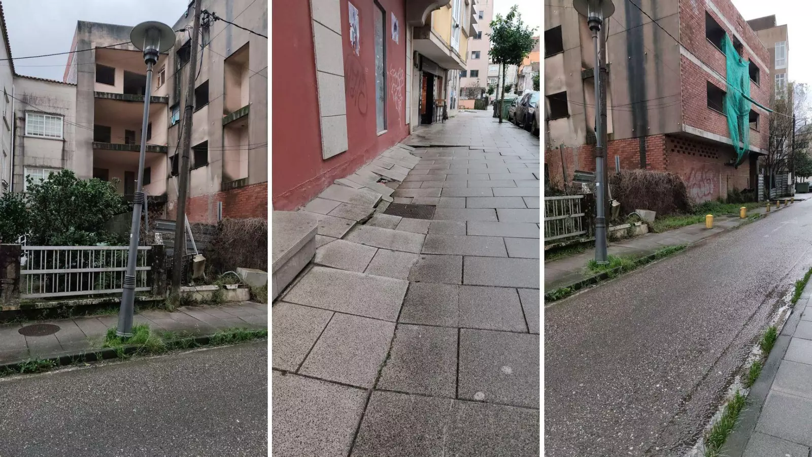 Aceras hundidas, farolas a punto de caer, socavones en el asfalto y un edificio okupado en una calle de apenas 300 metros de longitud