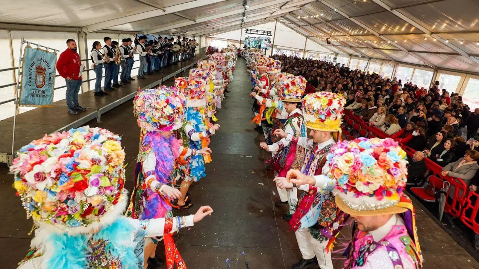 Finalizadas las actividades en el exterior, llegó uno de los momentos más entrañables de la tarde. Este año, con doble emoción. Bailar por última vez en esta edición ante un público entregado y hacerlo con una comitiva histórica. Cuarenta y seis parejas, cerca de un centenar de bailarines acompañados por los músicos de la agrupación de Aires de Cobres, llenando de vida un espectáculo que no dejó indiferente a nadie. La familia de la Asociación Cultural Cobres creció al mismo ritmo que la carpa, más amplia y con un escenario de 35 metros para lucir uno de los carnavales más excepcionales de la provincia de Pontevedra. Tanto por la indumentaria de madamas y galáns como por todo lo que le rodea. Un carnaval que no se contempla: se vive.