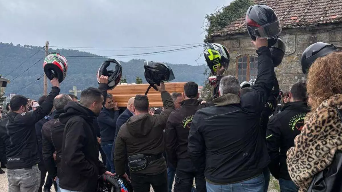 Moteros de Cangas y Moaña hicieron sonar sus motores a las puertas del tanatorio para después hacerle su último paseíllo cascos en alto a las puertas de la iglesia