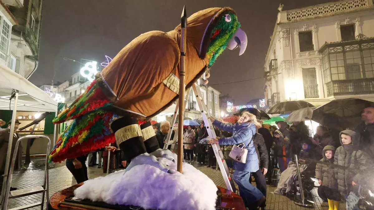 El loro Ravachol desveló este martes su disfraz. Decidió vestirse de inuit para apoyar a Groenlandia y como crítica a las políticas de Donald Trump. El papagayo llegó con 3.000 plumas de colores confeccionadas por la Asociación Recreativa Xeve y permanecerá junto a la botica de Perfecto Feijóo, en la Plaza de La Peregrina, hasta el próximo sábado.