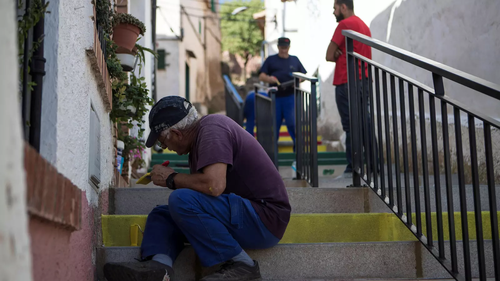 Habituado al ritmo trepidante de los millones de habitantes de París o de Valencia, Khaïri ha averiguado el valor del tiempo en un lugar con 50 personas censadas. Lo que ha hecho en este pueblo de la provincia de Zaragoza es pasear por cada rincón junto a su cámara, con la que ha ido acumulando material para un documental, y más tarde pintar una escalera con "los colores de la alegría", afirma. Colores que él, artista de 29 años, no había descifrado en su plenitud. Los colores que se verán desde ahora en la escalera son los colores del día a día de Aladrén, donde todo pasa despacio, pero con una cromática intensa.