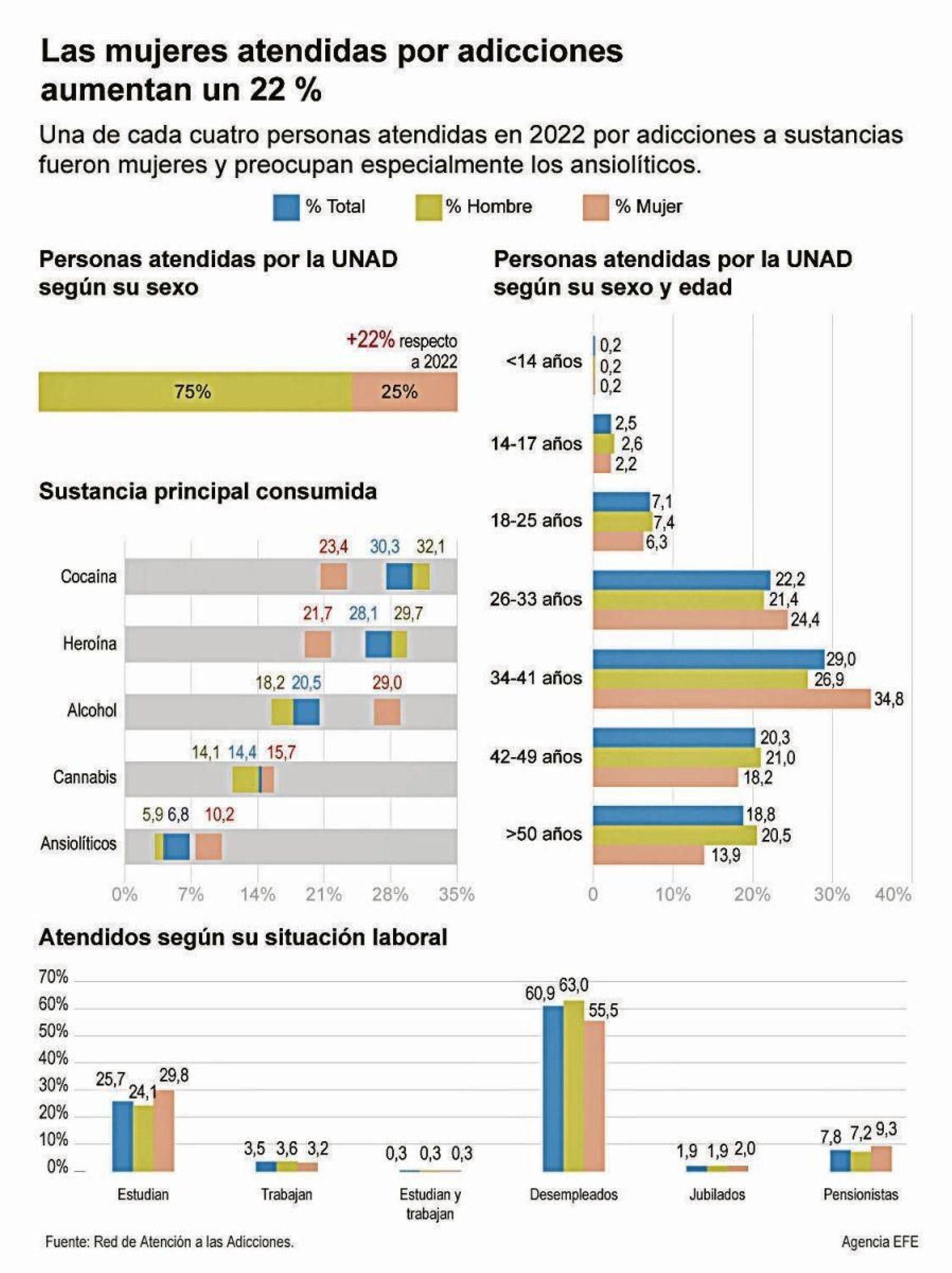 Entre las personas atendidas por las organizaciones que integran la UNAD, 46.343 tenían adicción a sustancias. La droga que más conduce a las mujeres al tratamiento es el alcohol, seguido de la cocaína, mientras que en los hombres son más prevalentes la cocaína y la heroína.