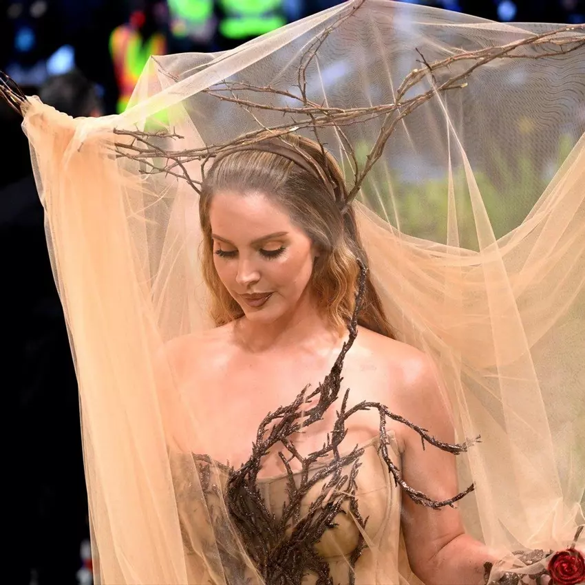 Lana del Rey. Puro exceso, la cantante se convirtió en una especie de `árbol` humano con un estructurado diseño transparente con raíces en color marrón de Alexander McQueen.